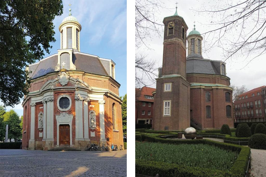 Bei beiden Gebäuden kommen der für Münster typische helle Sandstein und rötlicher Backstein zum Einsatz. Diese Kombination verleiht den Bauten eine elegante, aber nicht übermächtige Wirkung. Zusätzlich verfügt die Clemenskirche über eine markante Kuppel, die von einer Laterne bekrönt wird.